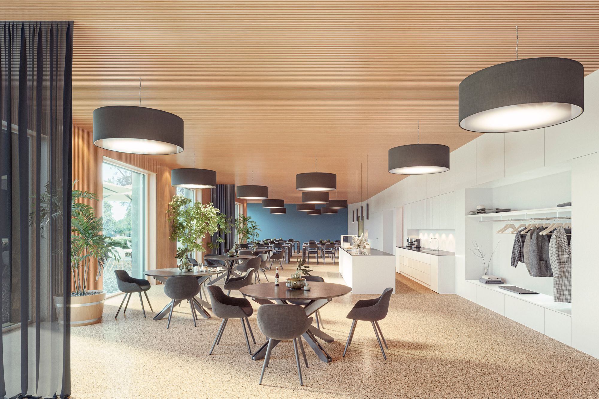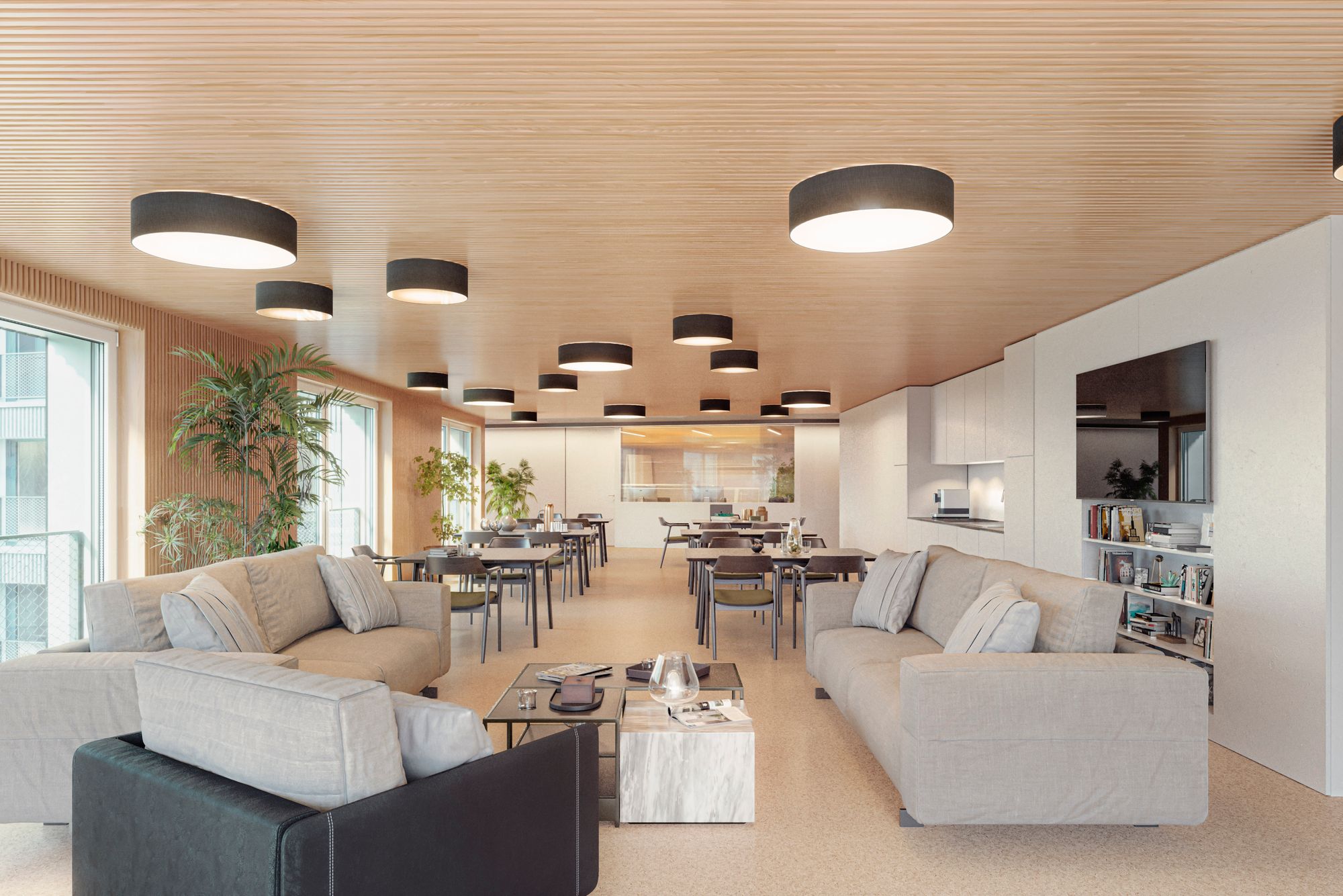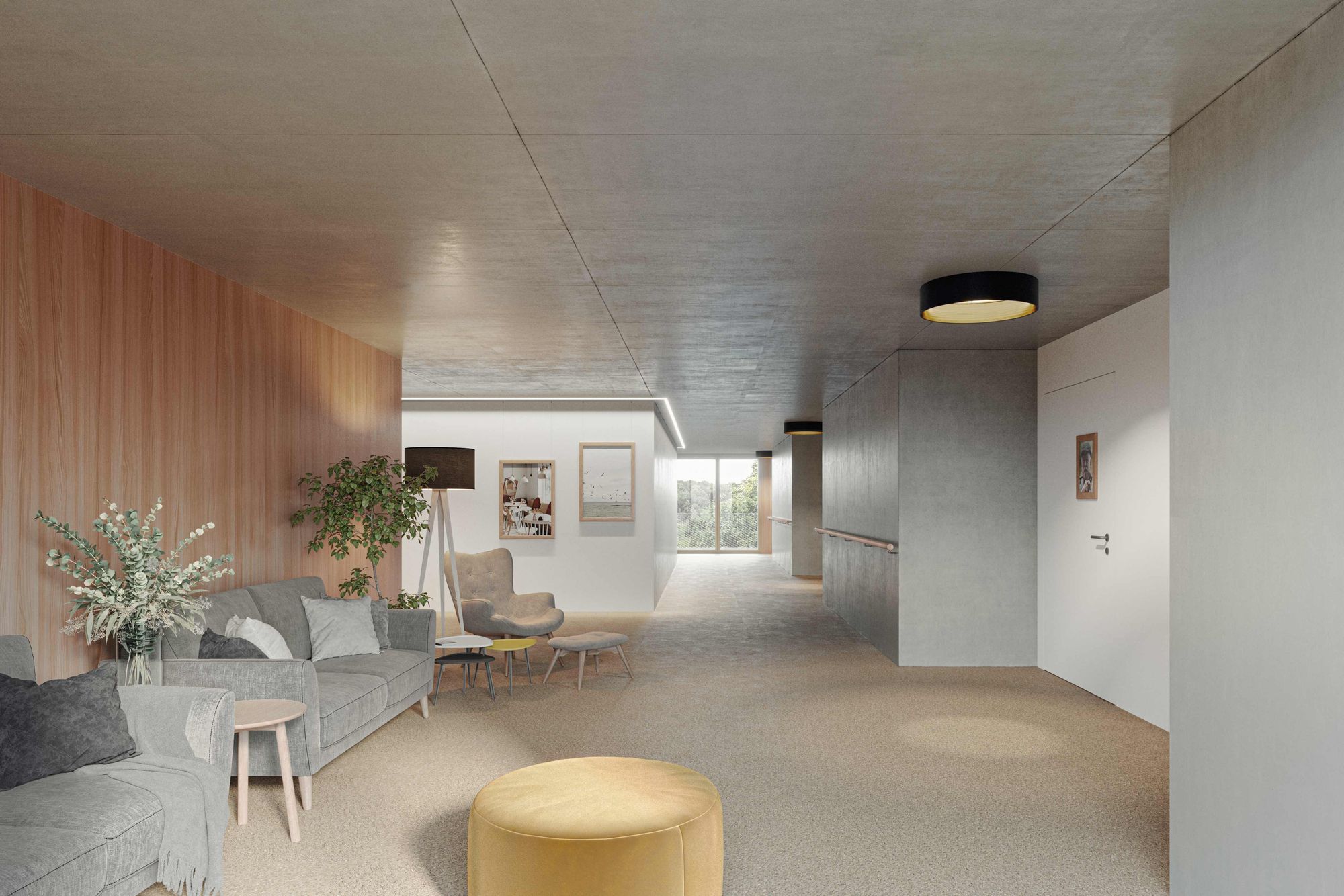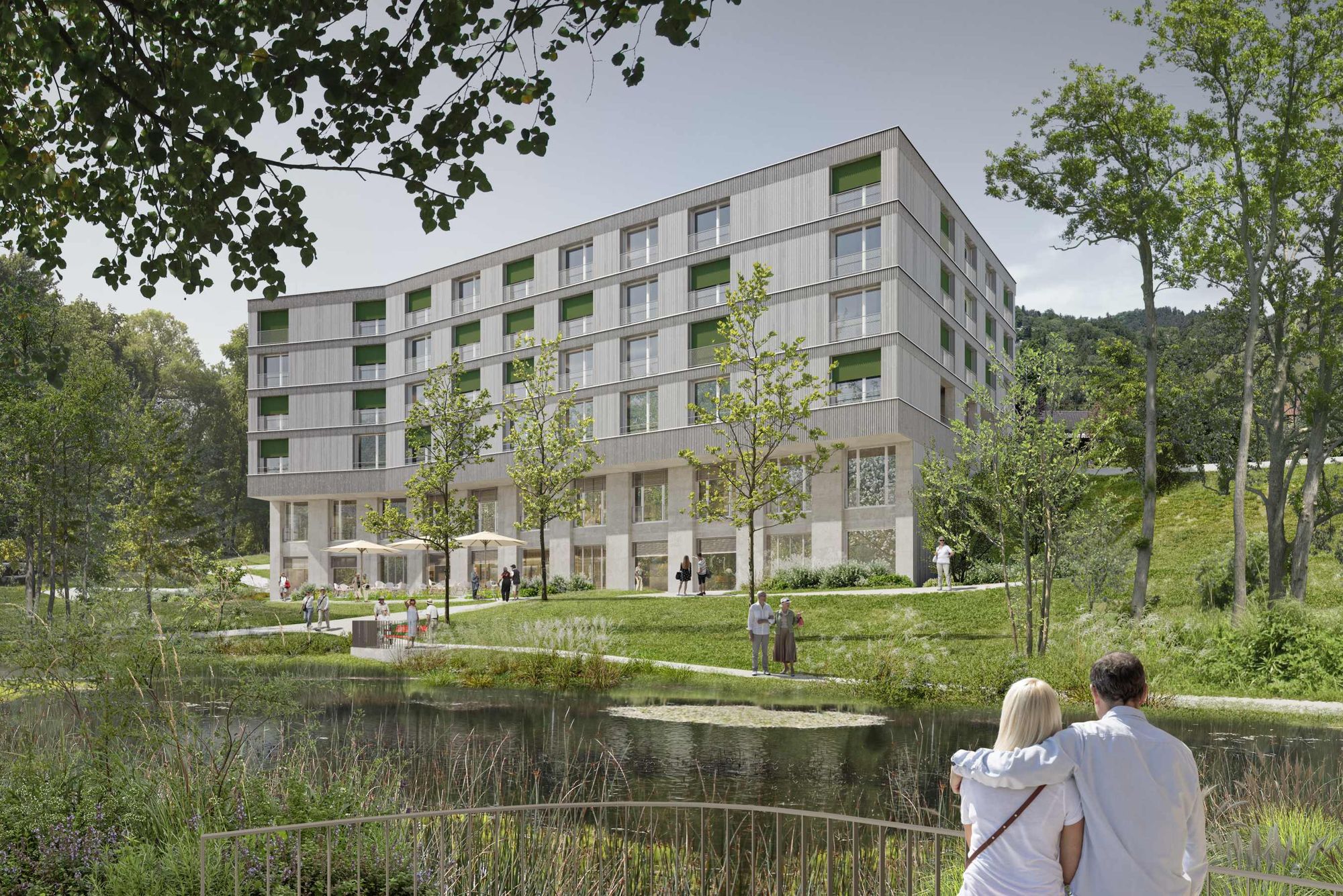 Die offene Bauweise fördert Begegnungen und entspricht den Bedürfnissen eines modernen Pflegezentrums. Vier Etagen des Verahus liegen oberirdisch, zwei sind hangseits integriert. Grossflächige Verglasung flutet die Innenräume mit Tageslicht und verbindet Architektur mit Landschaft. Ein dreistöckiger Erschliessungsbereich bildet das Herzstück und verknüpft beide Eingänge. Sichtbeton kombiniert mit Holzelementen prägt die moderne, einladende Fassadengestaltung.